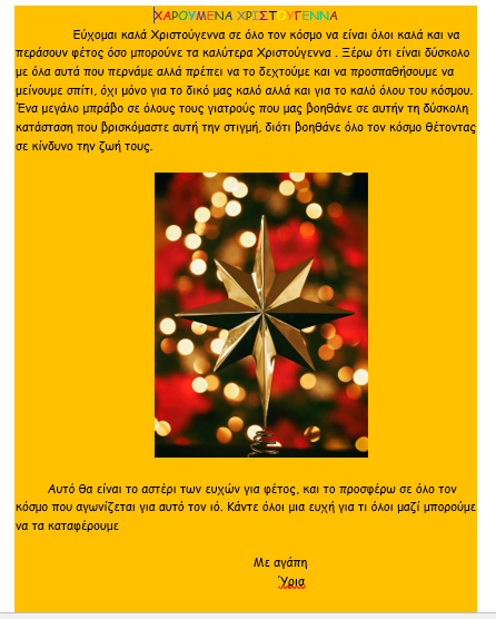 Σας εύχομαι δύναμη, κουράγιο, υπομονή και σας στέλνω όλη μου την αγάπη για τις γιορτές ! Μελίνα από το 6ο Δημοτικό Σχολείο Άργους
