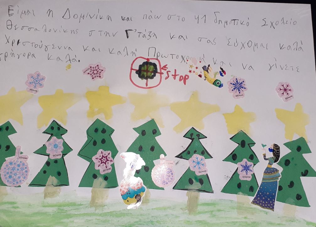 Είμαι η Δομινίκη και πάω στο 41ο Δημοτικό Σχολείο Θεσσαλονίκης στην Γ΄τάξη και σας εύχομαι καλά Χριστούγεννα και καλή Πρωτοχρονιά και να γίνετε γρήγορα καλά.